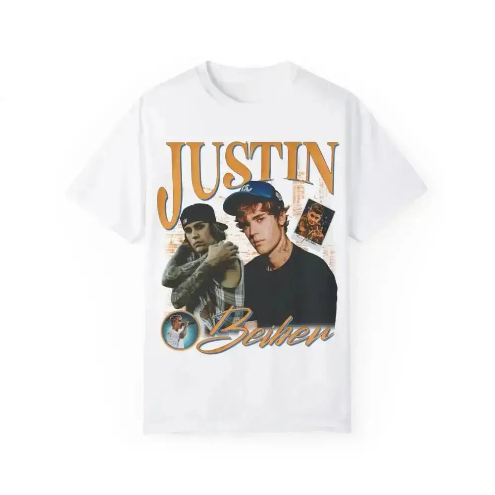 Get ready to rock your style with this epic Retro Justin tee! Featuring a cool vintage-inspired design, it showcases Justin's iconic image and bold orange text. Available in classic white or sleek gray, this Comfort Colors shirt offers both comfort and attitude. The alt preview gives you a sneak peek at its awesome aspect ratio and eye-catching artwork.